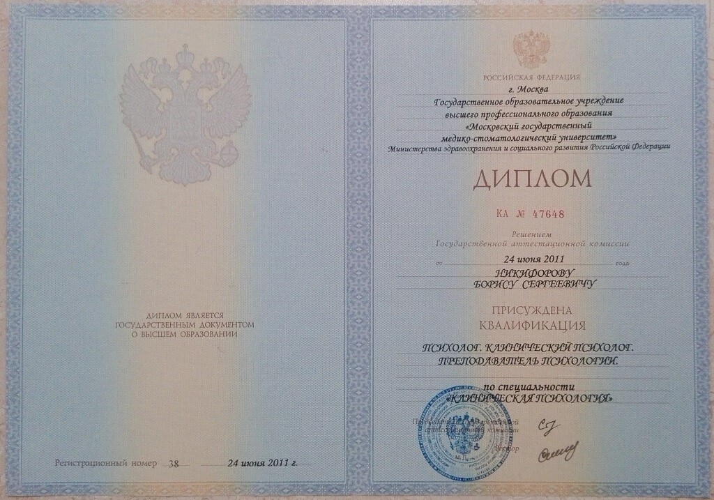 Московский государственный медико-стоматологический университет. Присвоена квалификация психолога, клинического психолога, преподавателя психологии.
