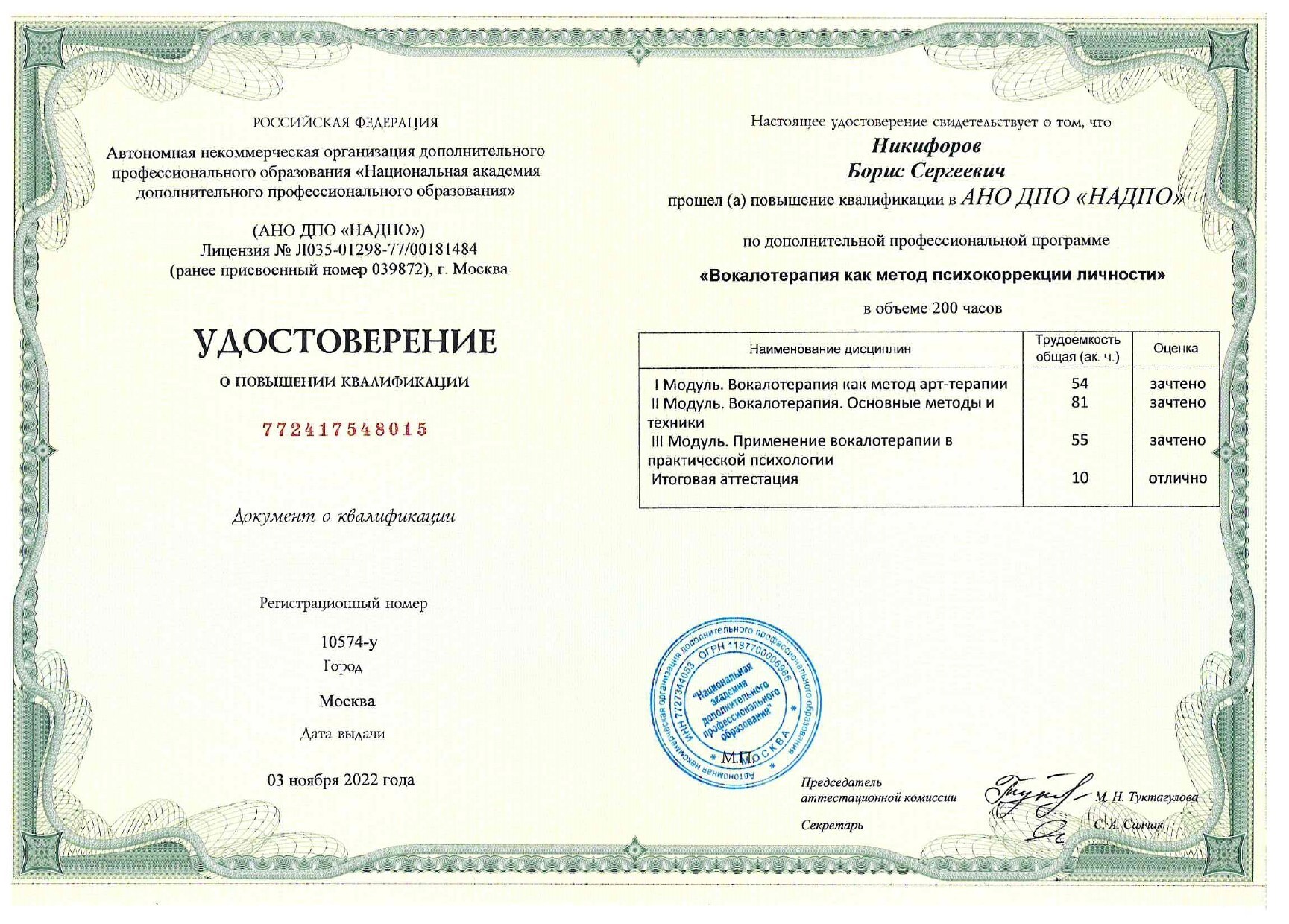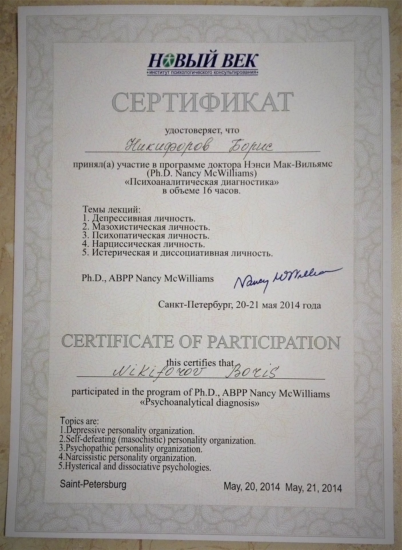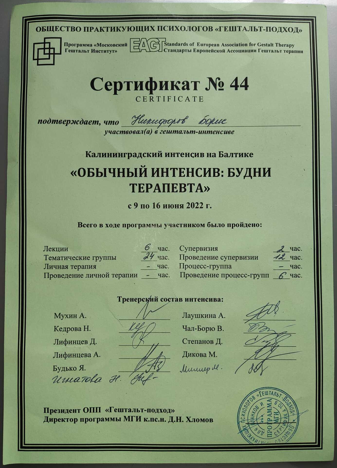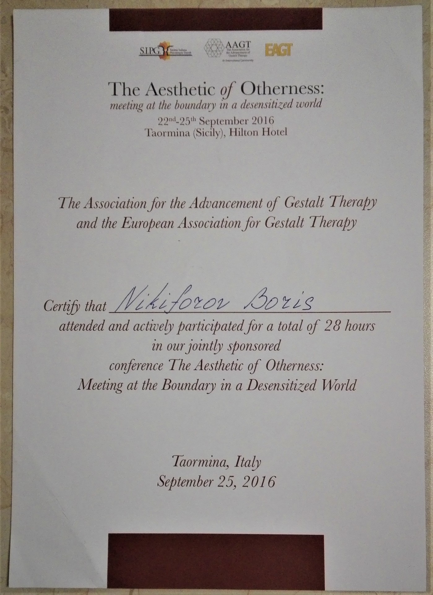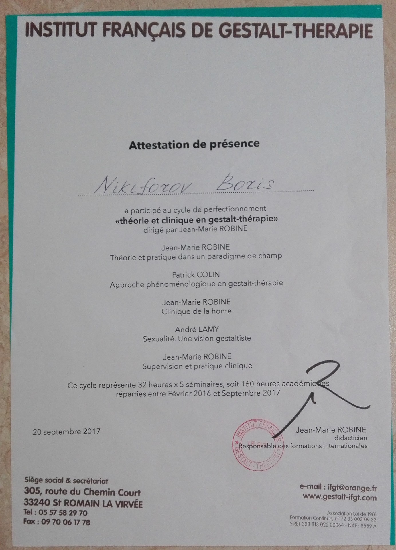 о прохождении повышения квалификации "Теоретическая и клиническая гештальт-терапия" (2016-2017).