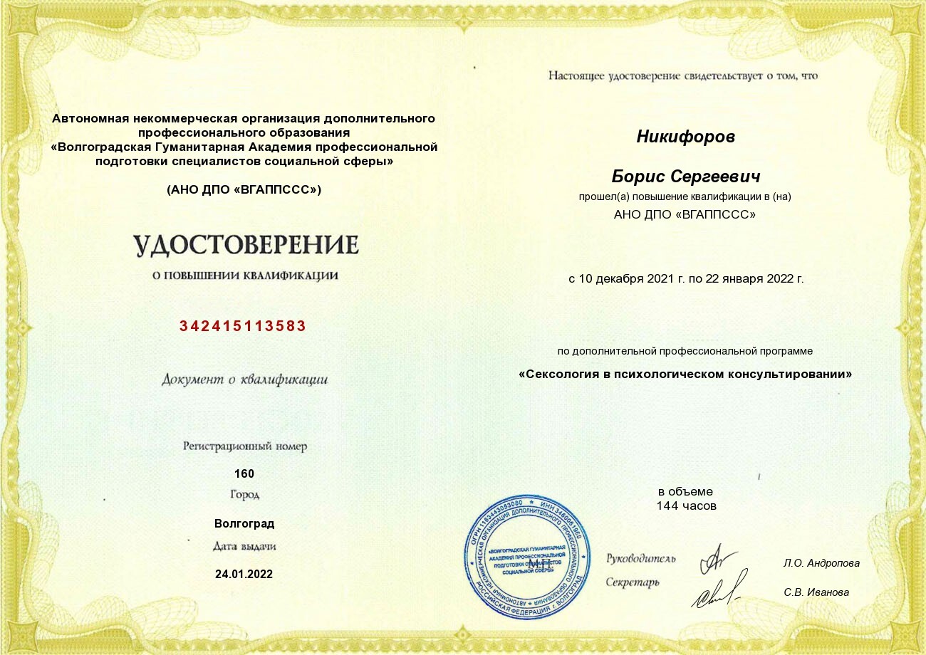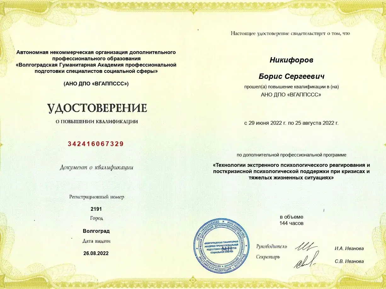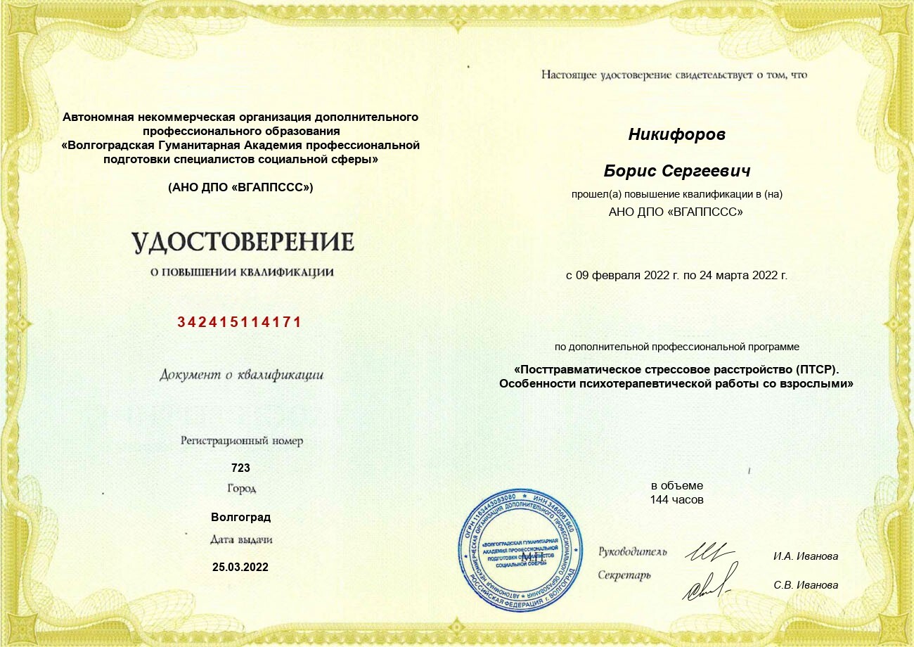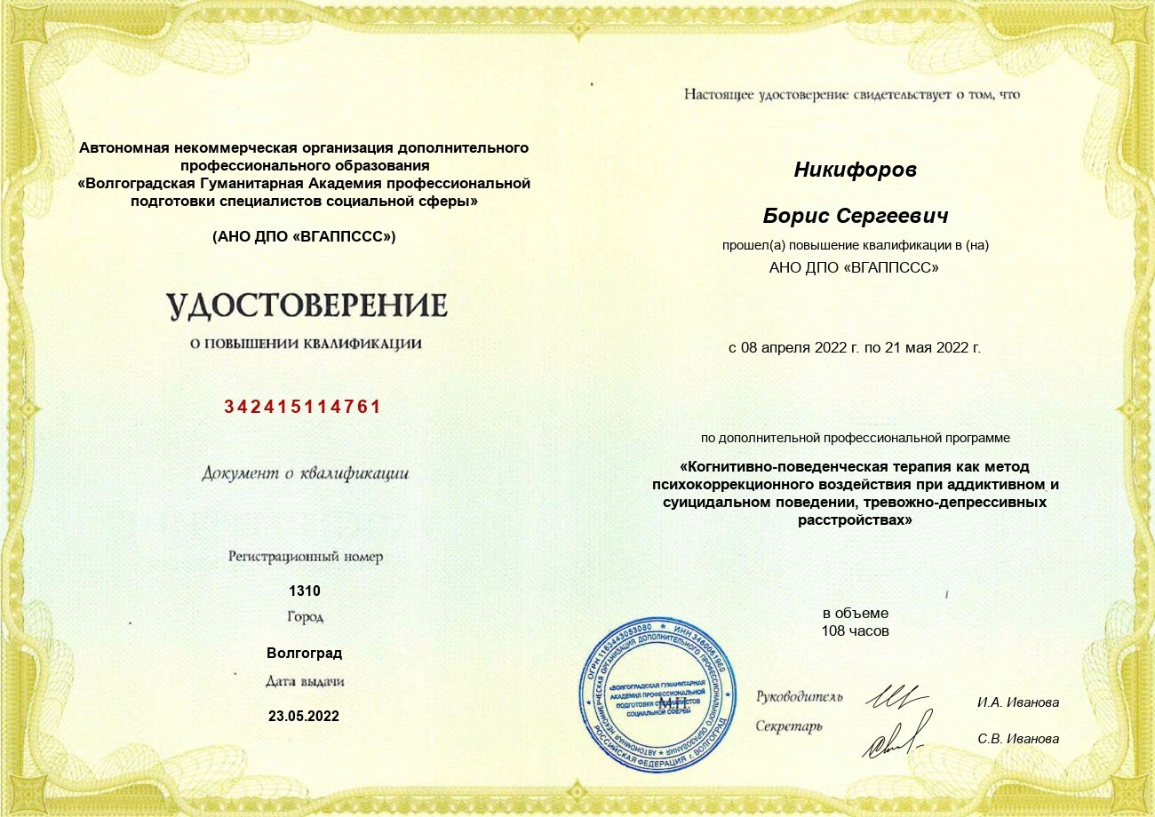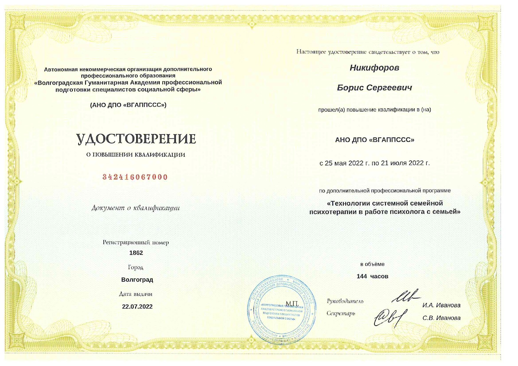 о прохождении повышения квалификации "Теоретическая и клиническая гештальт-терапия" (2016-2017).