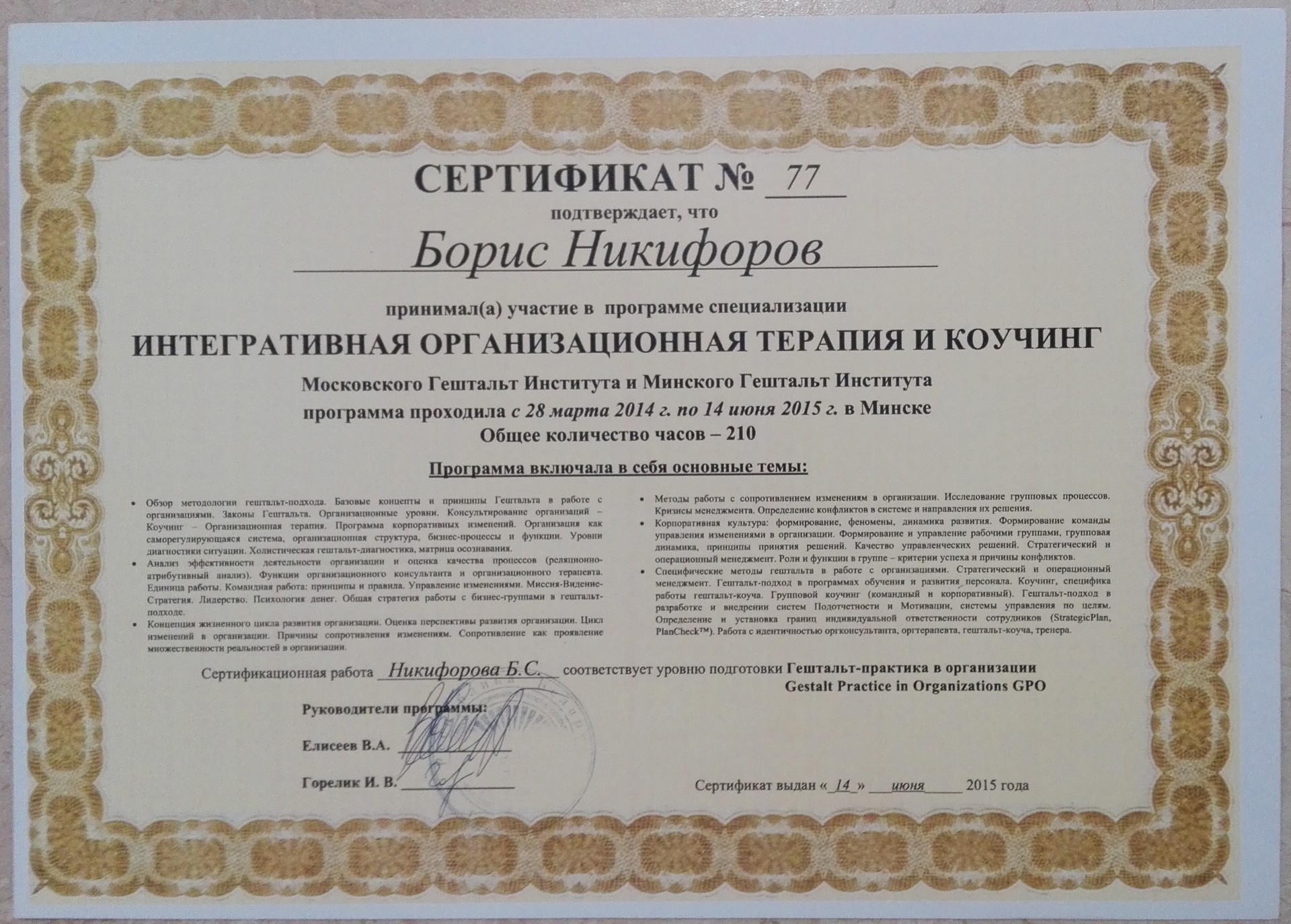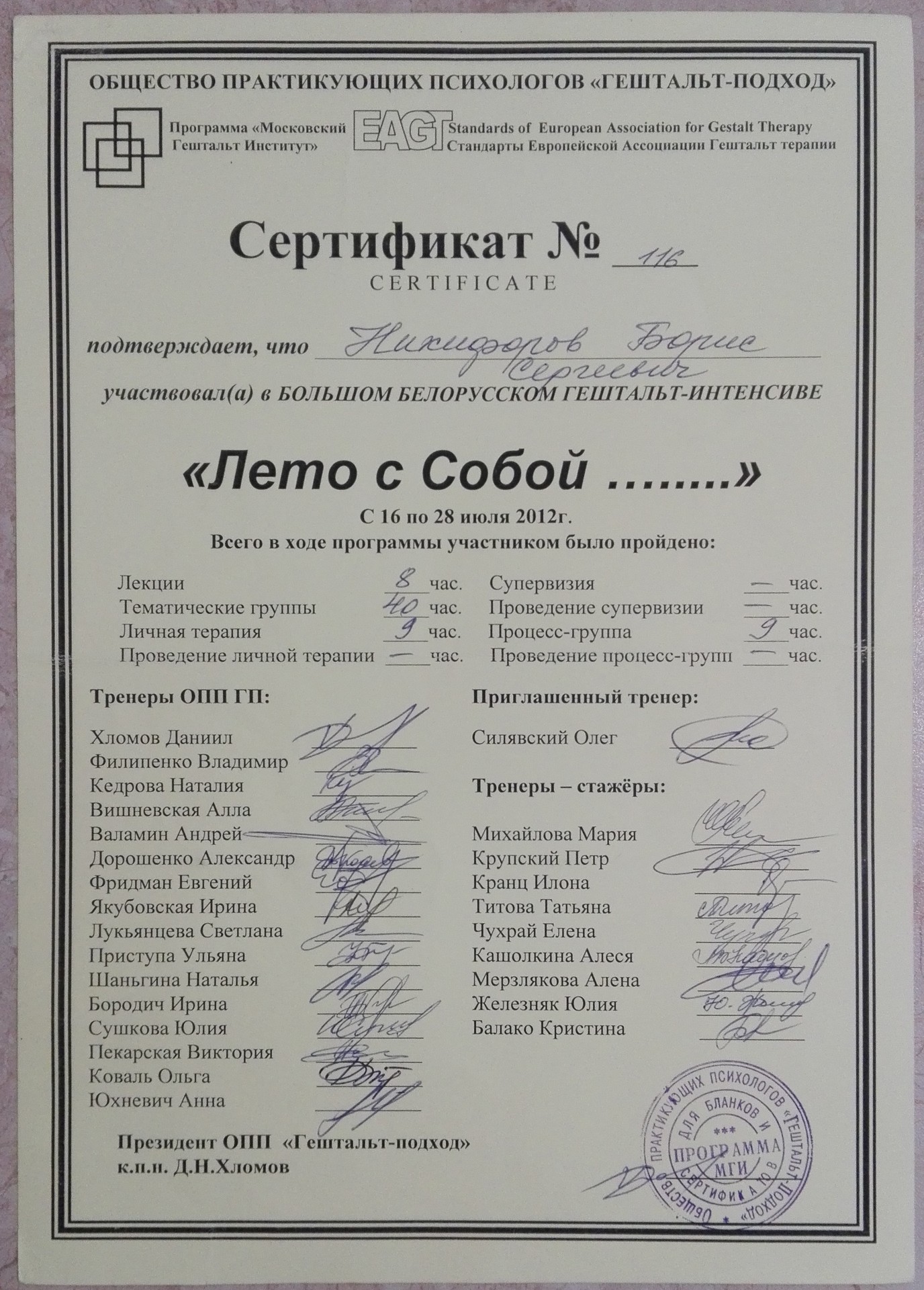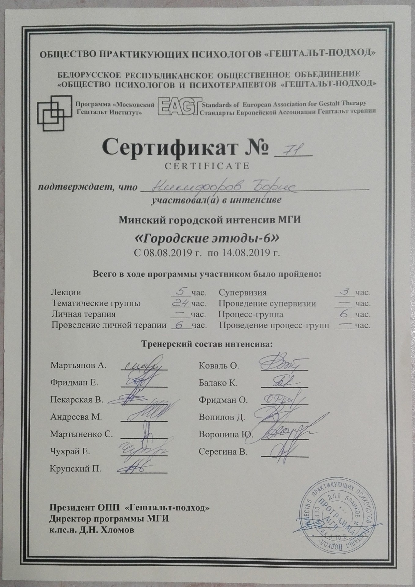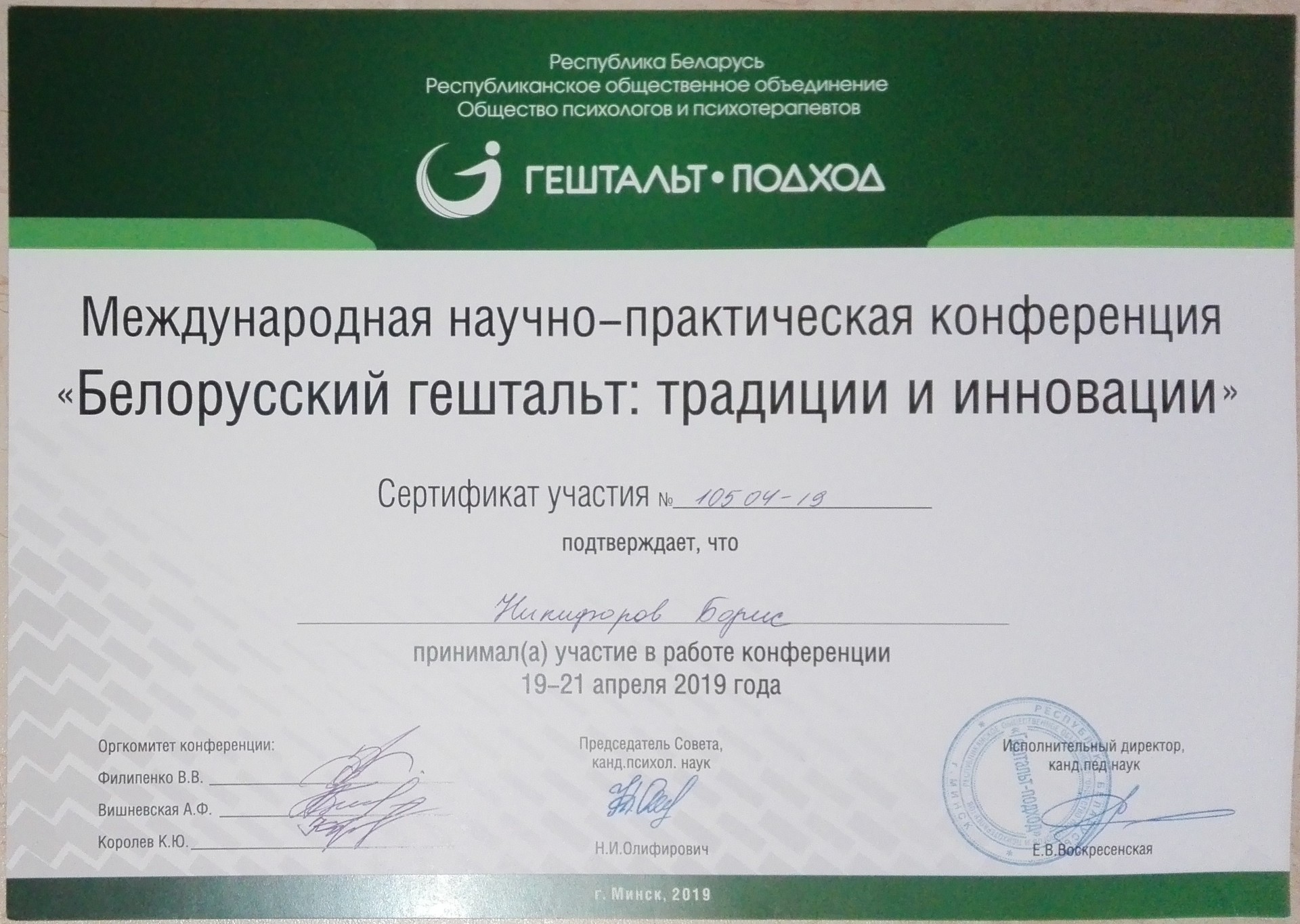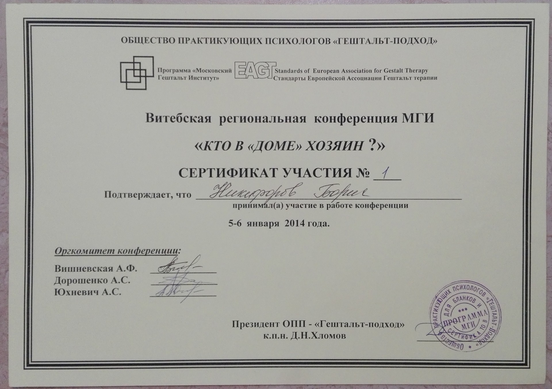 Московский гештальт институт совместно с Минским гештальт институтом. Присвоена квалификация гештальт-практика в организациях.