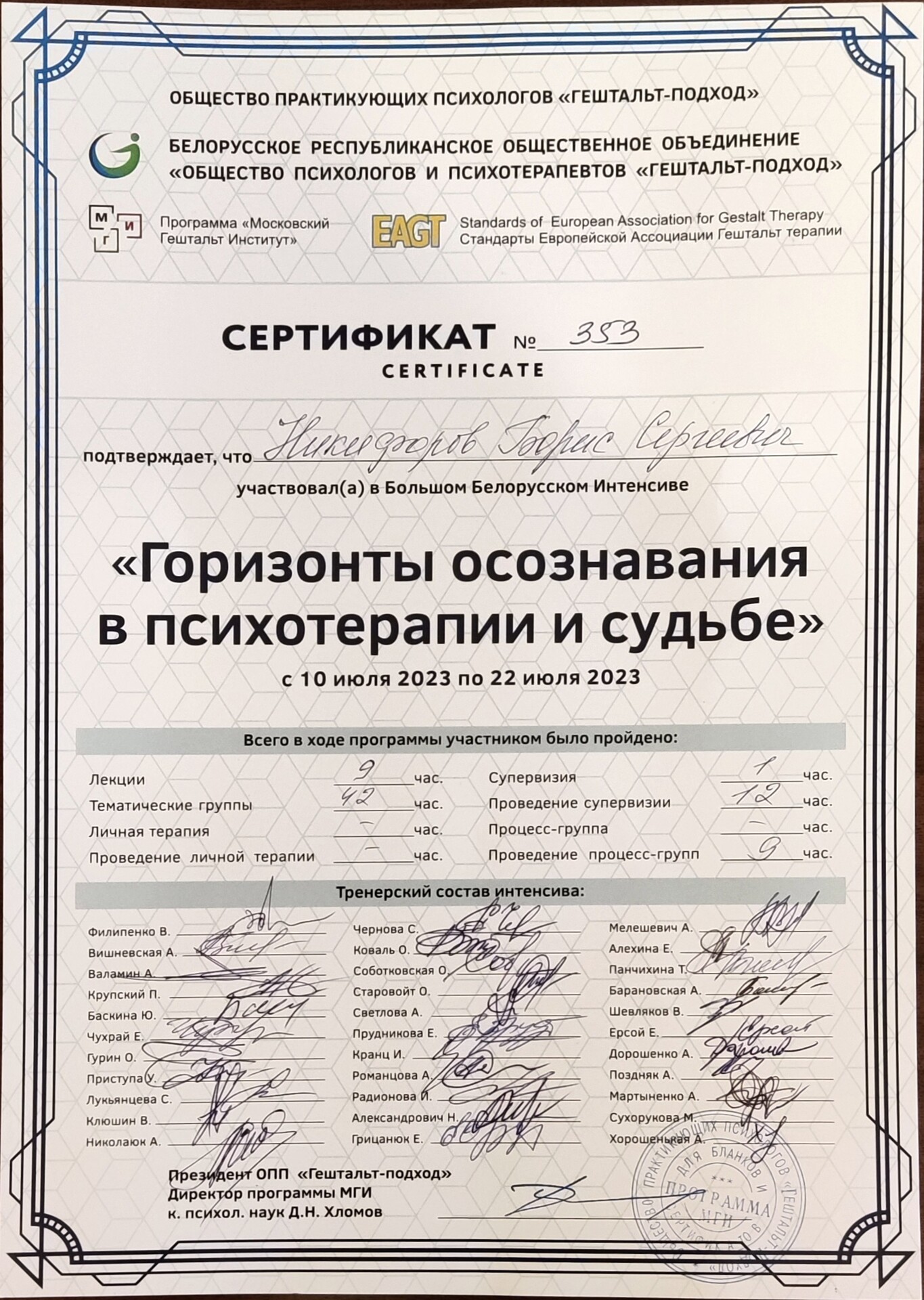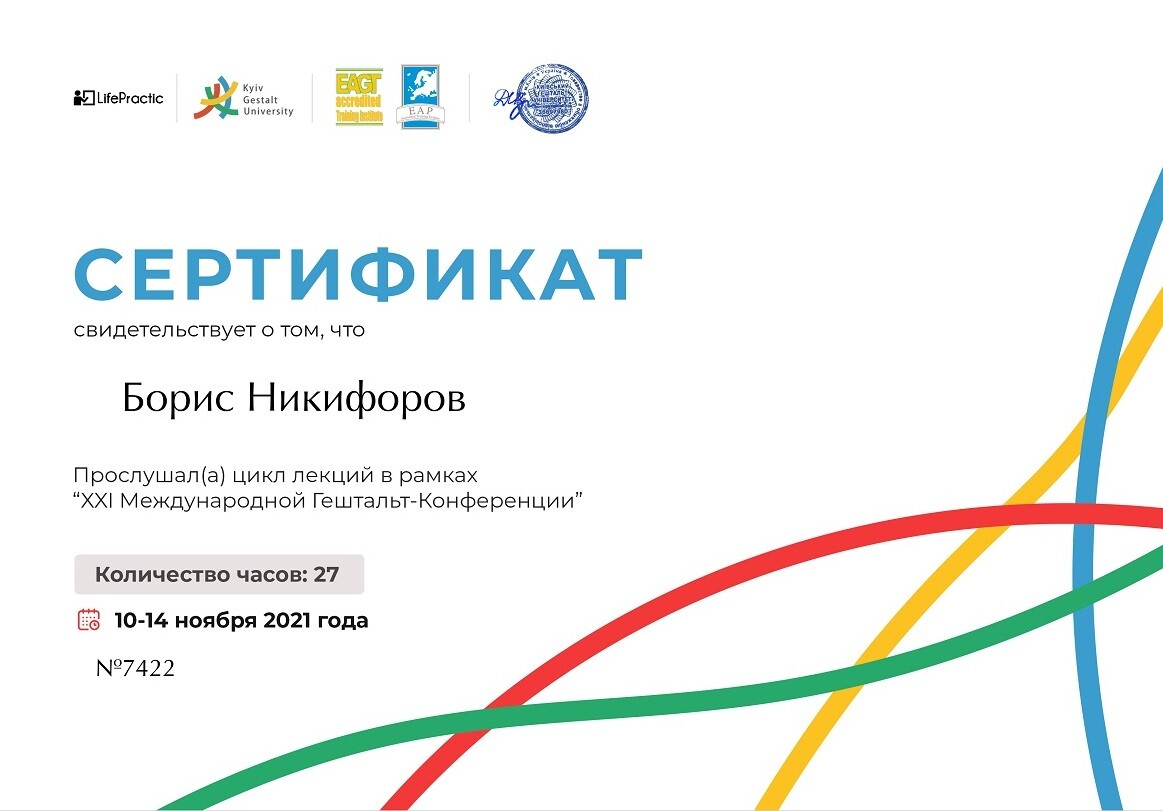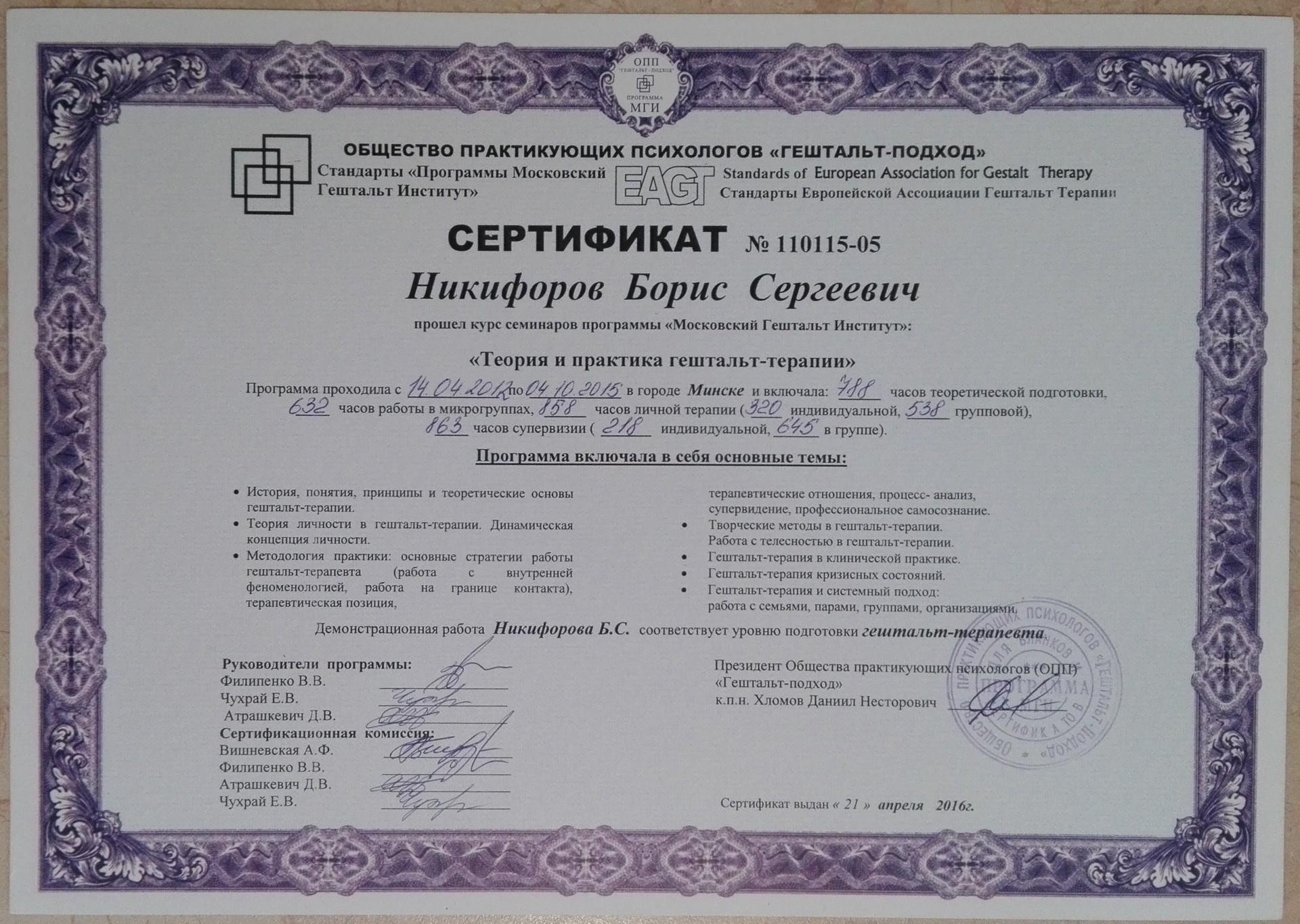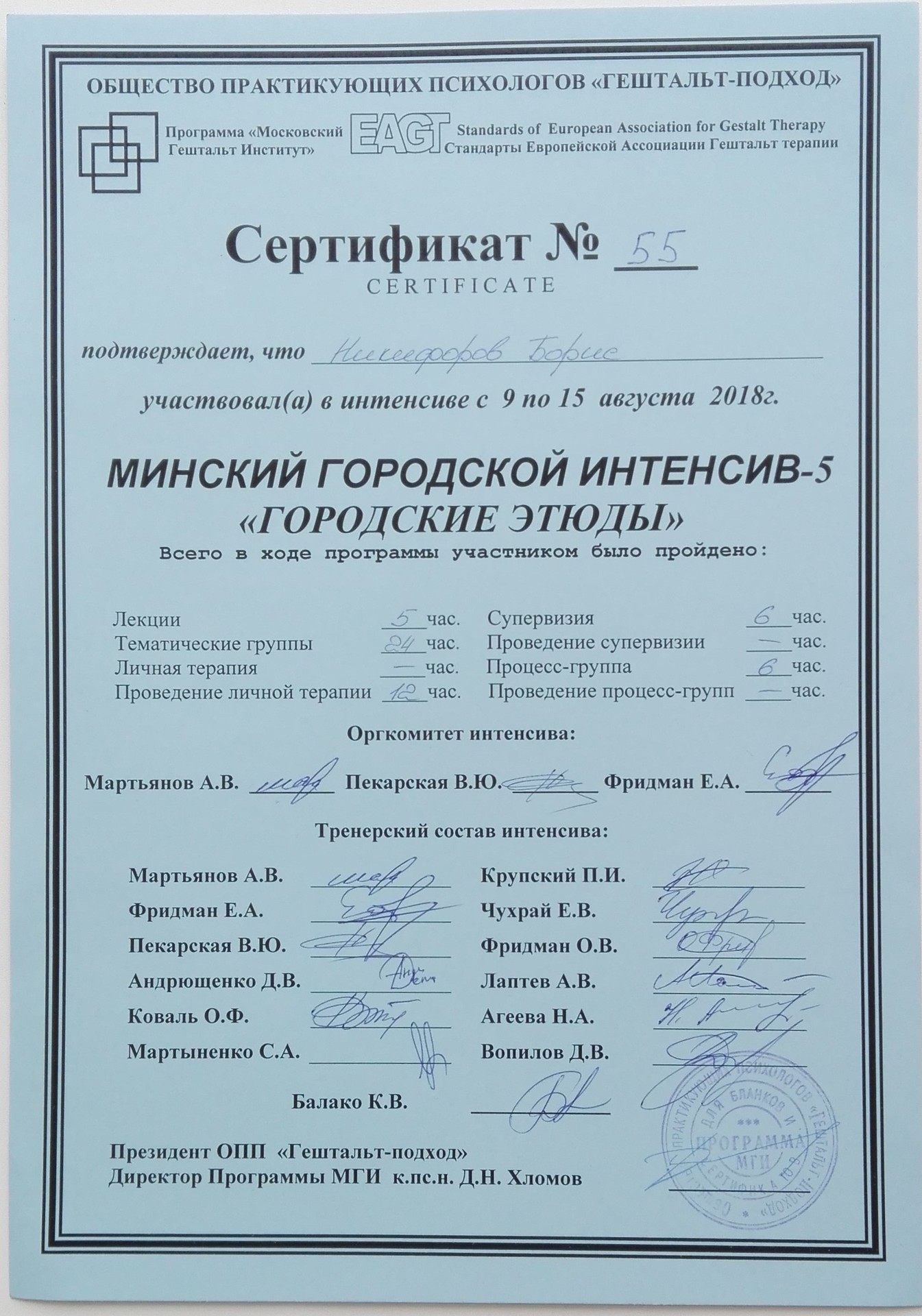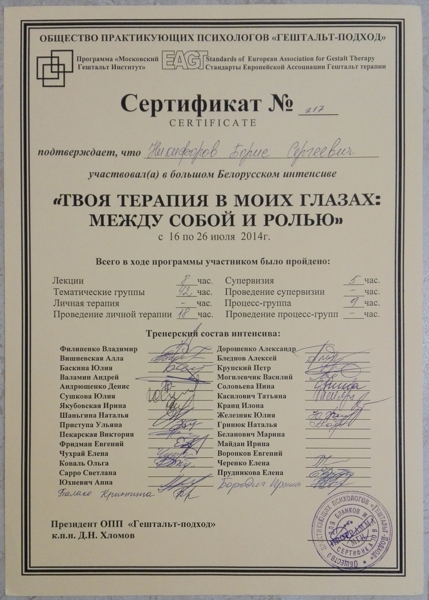 Московский гештальт институт совместно с Минским гештальт институтом. Присвоена квалификация гештальт-практика в организациях.