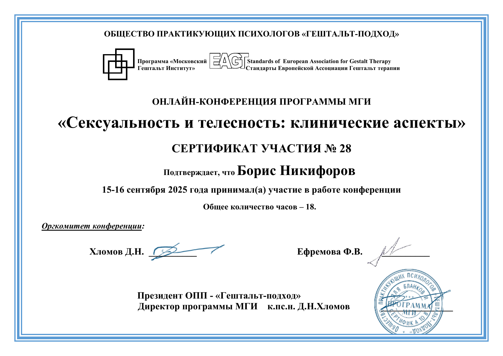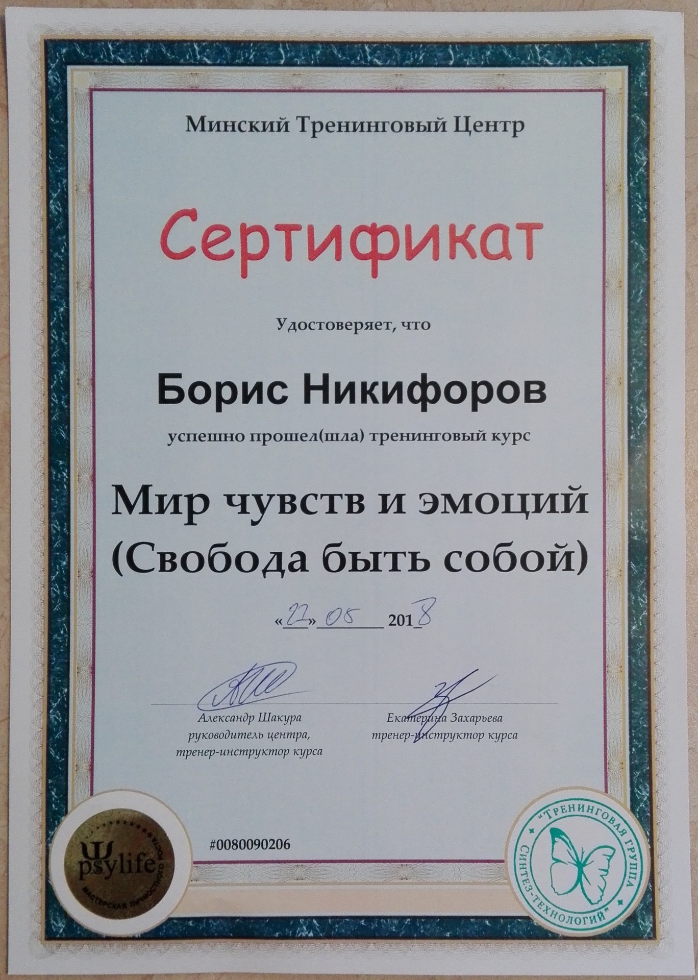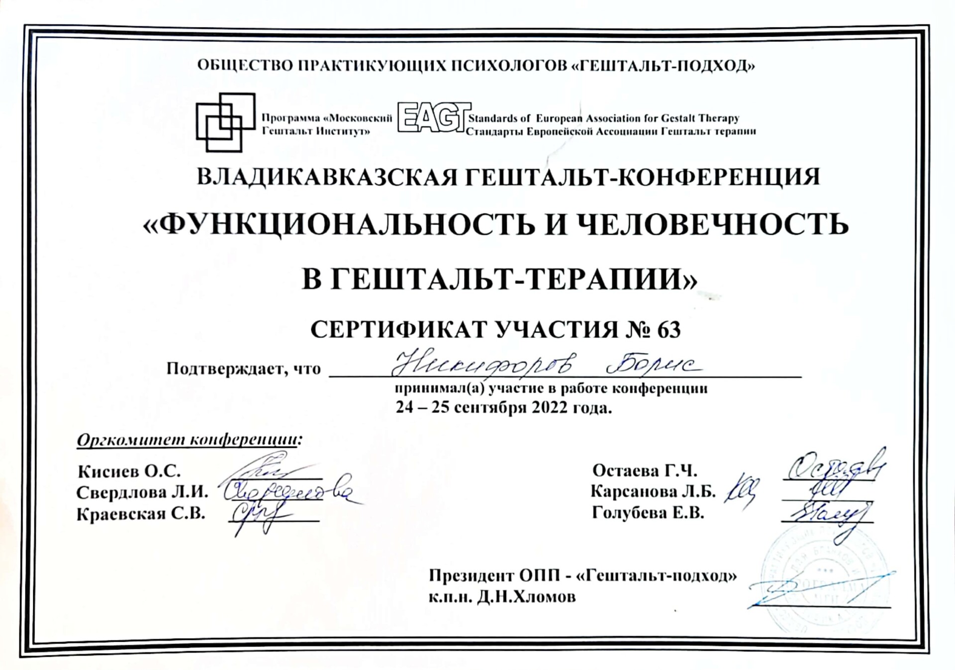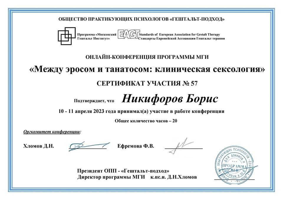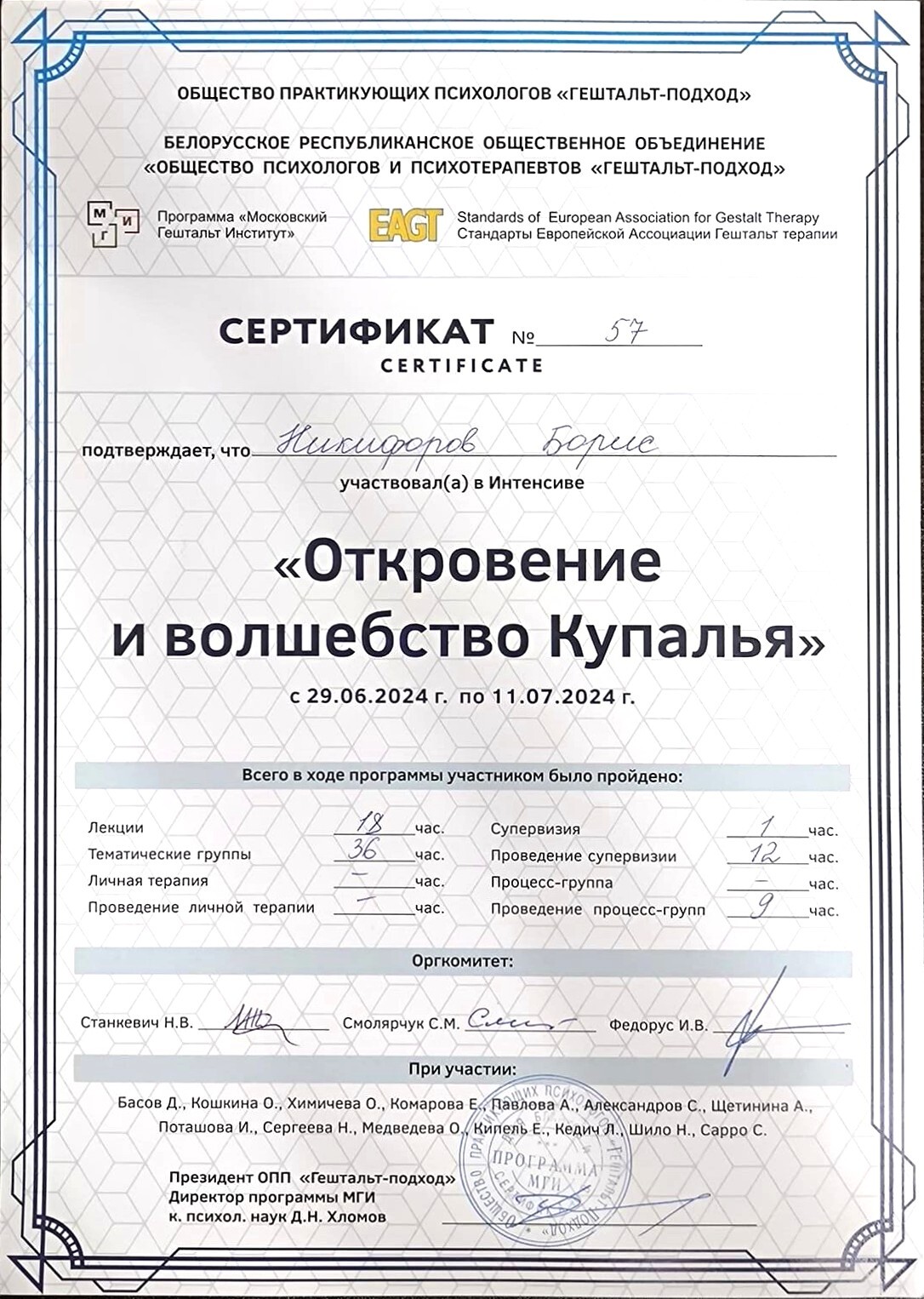 Московский гештальт институт совместно с Минским гештальт институтом. Присвоена квалификация гештальт-практика в организациях.