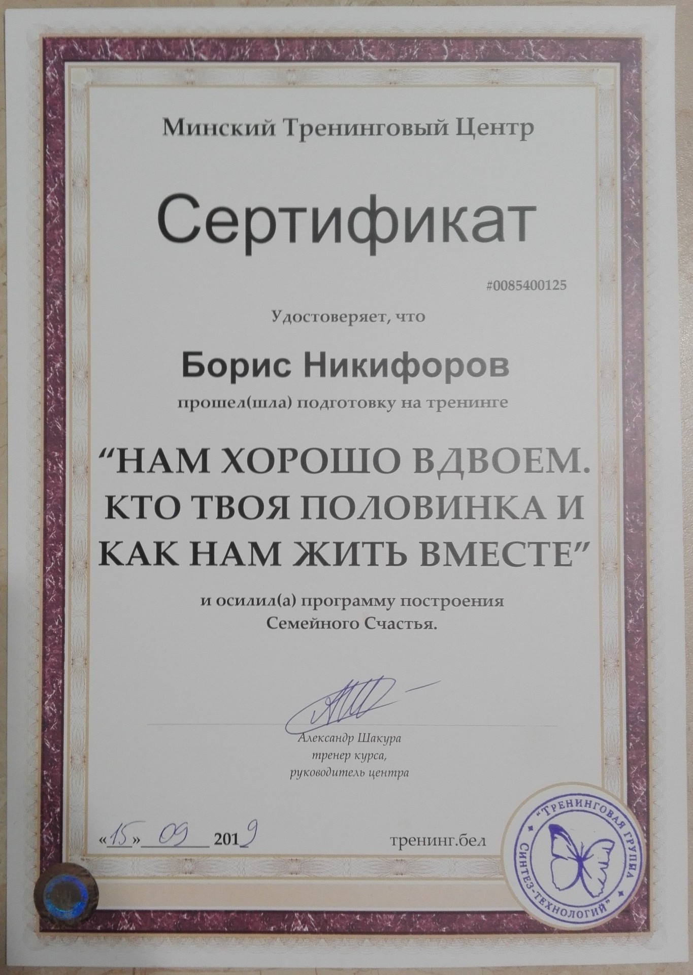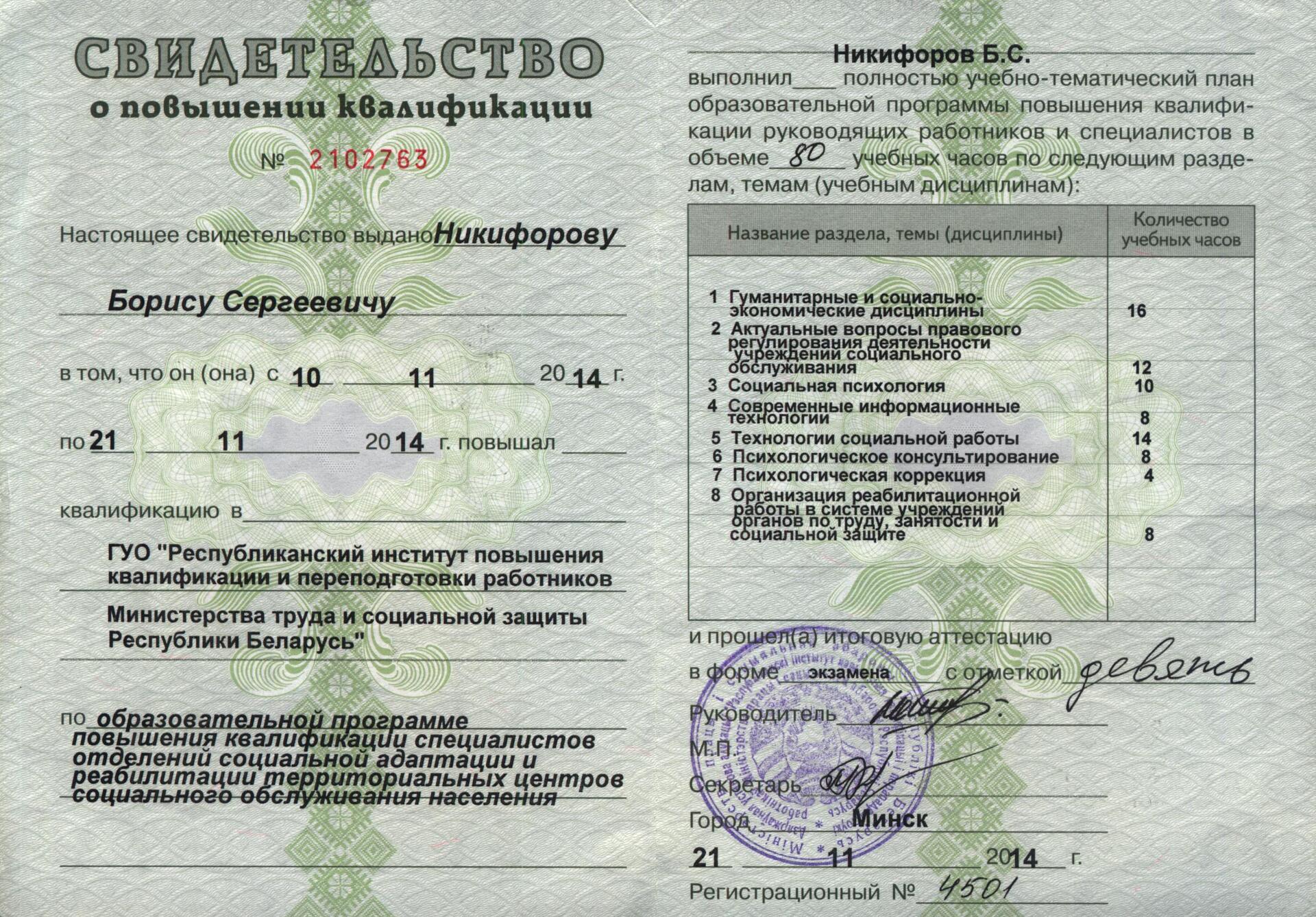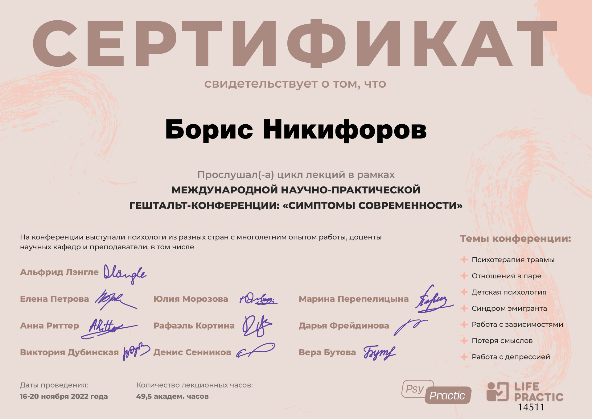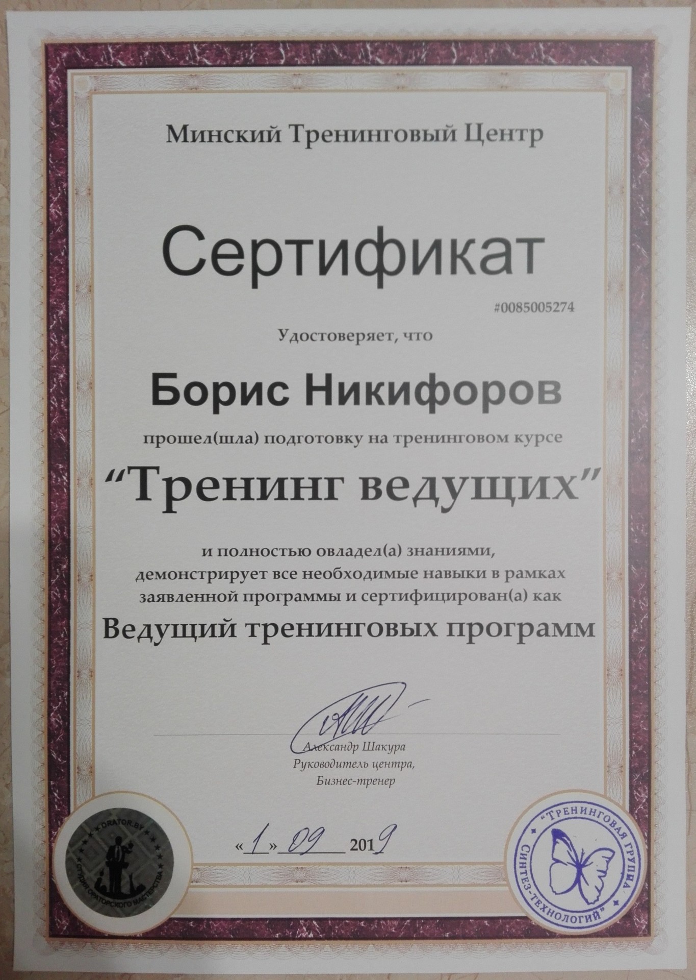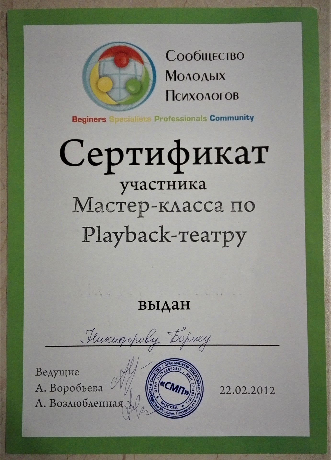 Московский гештальт институт совместно с Минским гештальт институтом. Присвоена квалификация гештальт-практика в организациях.