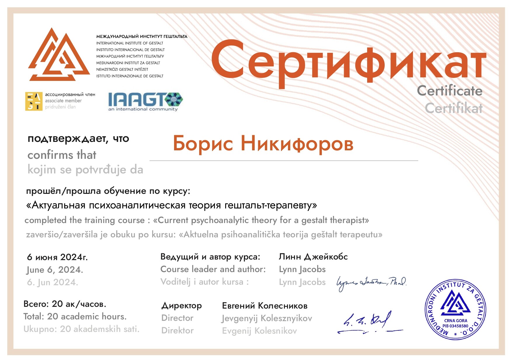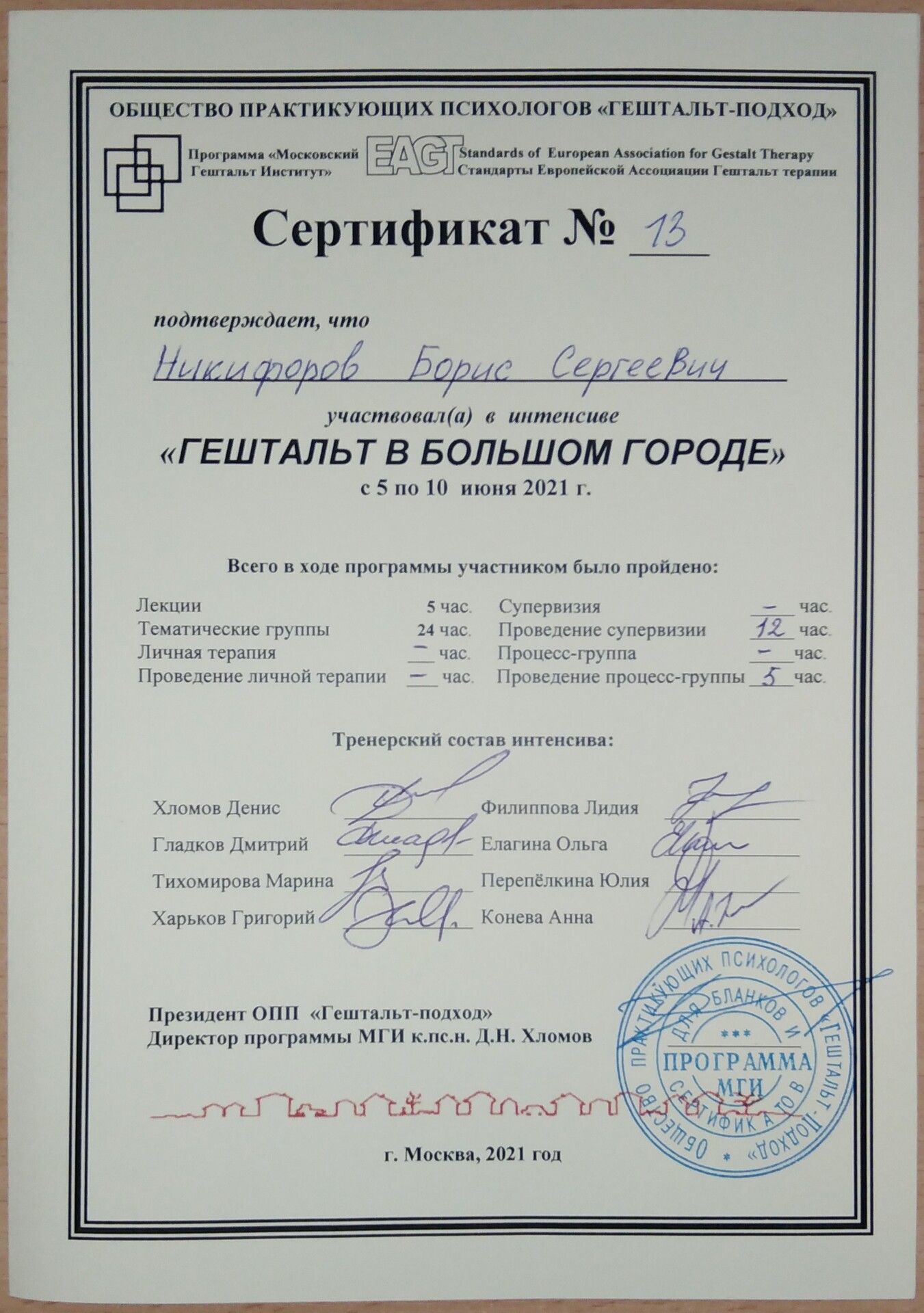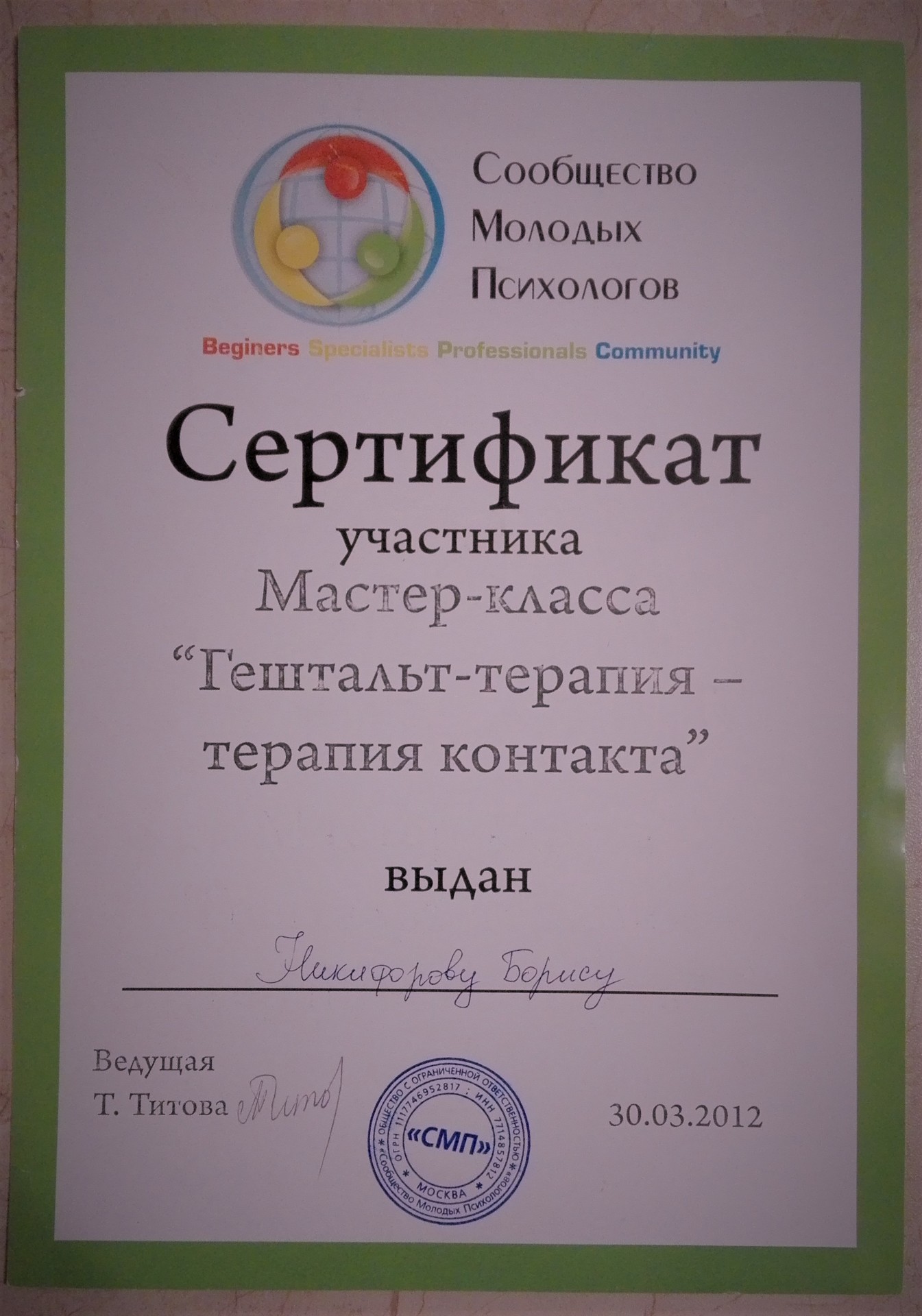 Московский гештальт институт. Присвоен статус гештальт-терапевта.