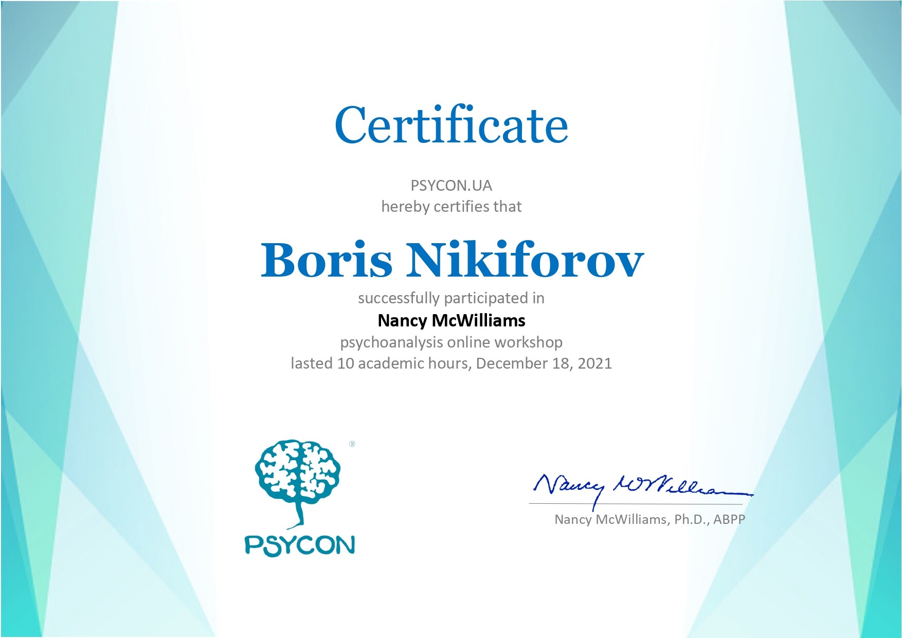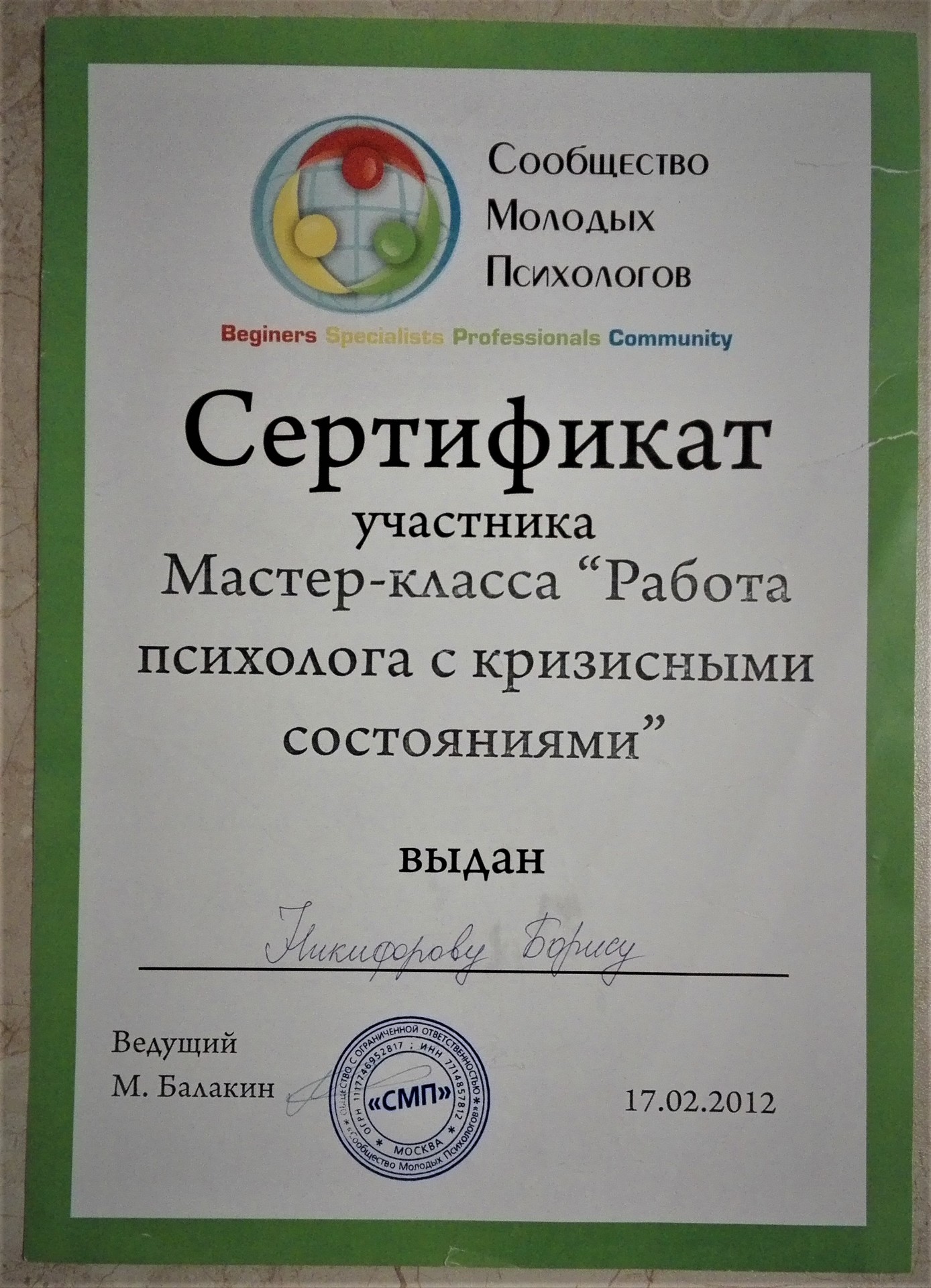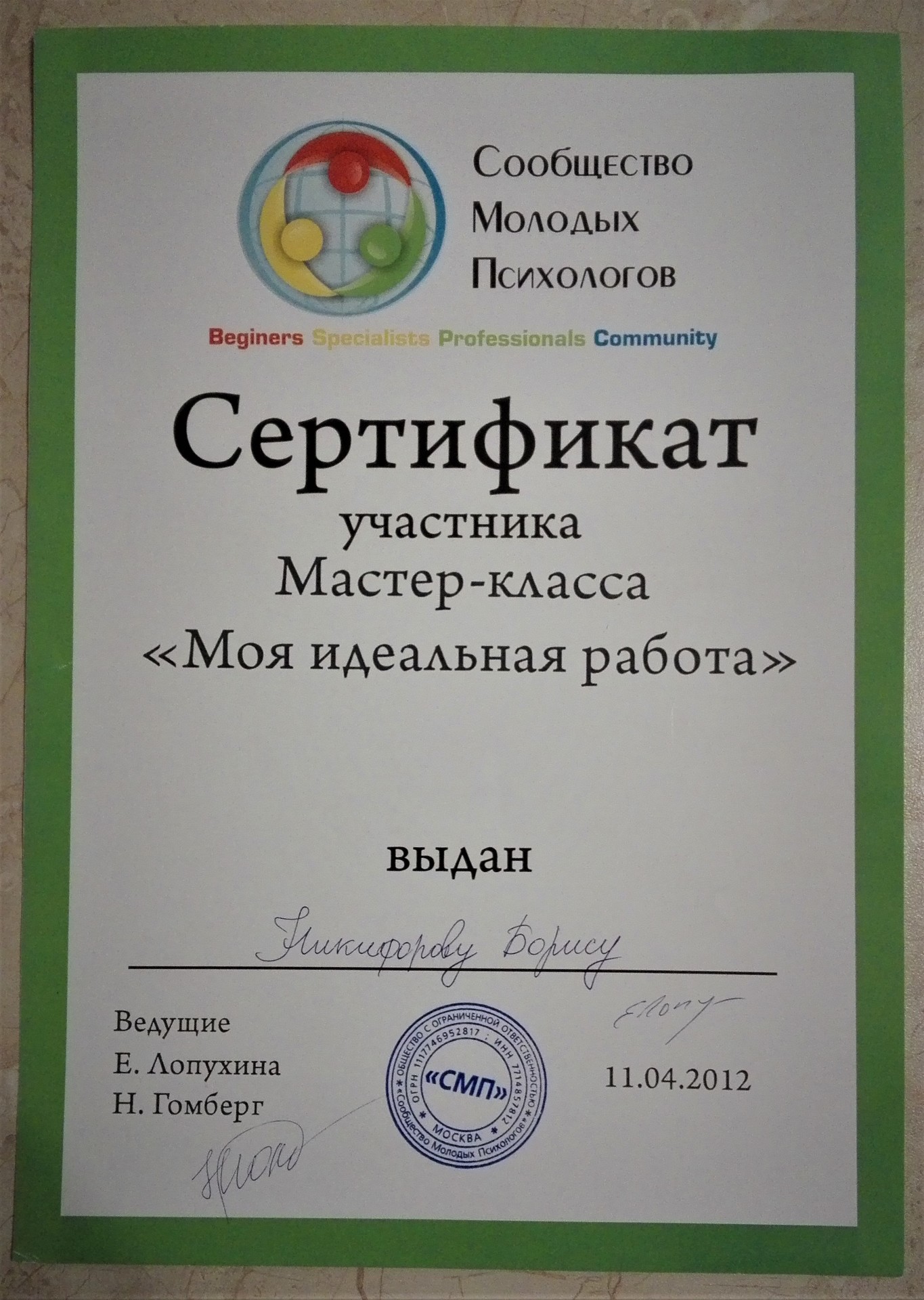 Московский гештальт институт. Присвоен статус гештальт-терапевта.