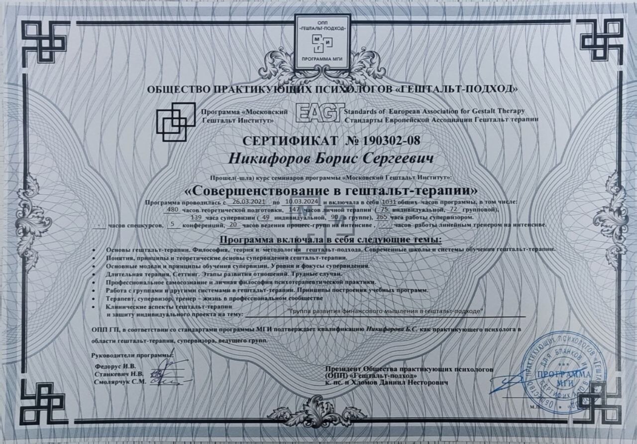 об окончании программы "Совершенствование в гештальт-терапии" (2021-2024).