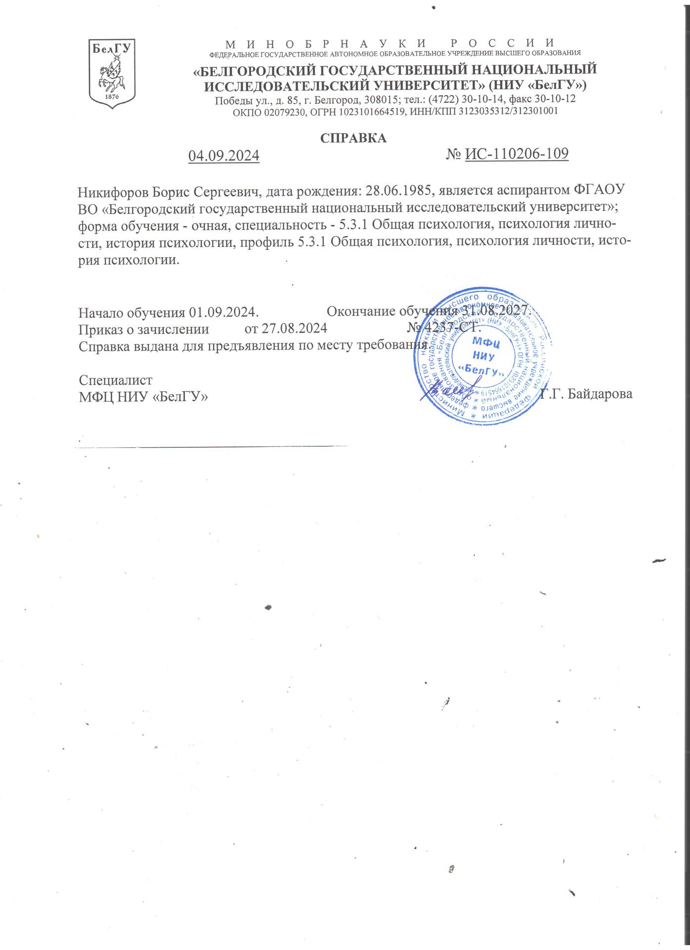 Белгородский государственный национальный исследовательский университет. Присовен статус аспиранта.