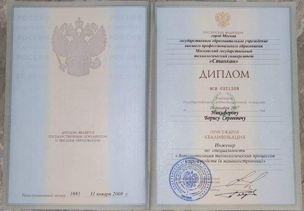 Московский государственный технологический университет "Станкин". Присвоен статус инженера.